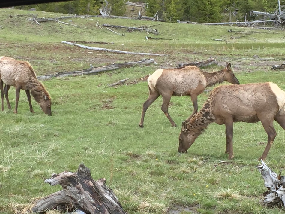 We left the Mountain Modern Hotel in Jackson Hole this morning with low spirits. It’s an awful, poorly designed hotel with thin walls and toilets made for elementary students. power outlets didn’t work. Lights flickered every time some shut a door. Never stay there. Anyway, our first impression of Yellowstone were some elk feasting on grass not far inside the South Gate.