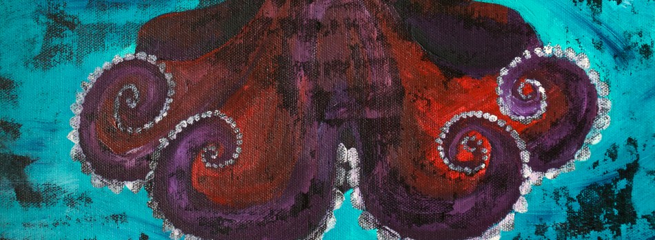 I have been experimenting with acrylic paints and ink washes on canvas boards. The first layers are acrylic paints. Then I add a opaque layer of black Indian Ink and let it dry for an hour. When I rinse it off, I get this effect. This painting is part of my sea life series.