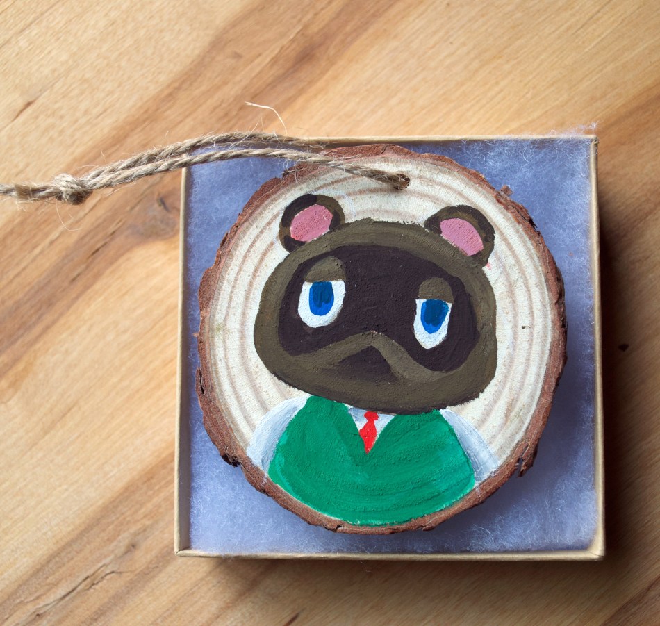 These hand painted wood slice ornaments were made by painting acrylic paint on half inch thick pieces of wood. I’m a huge fan of animal crossing so these were super fun to make. The front is Tom Nook and the back is the leaf Nook’s Cranny logo. Ornaments are available at my Etsy Store.