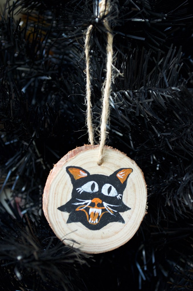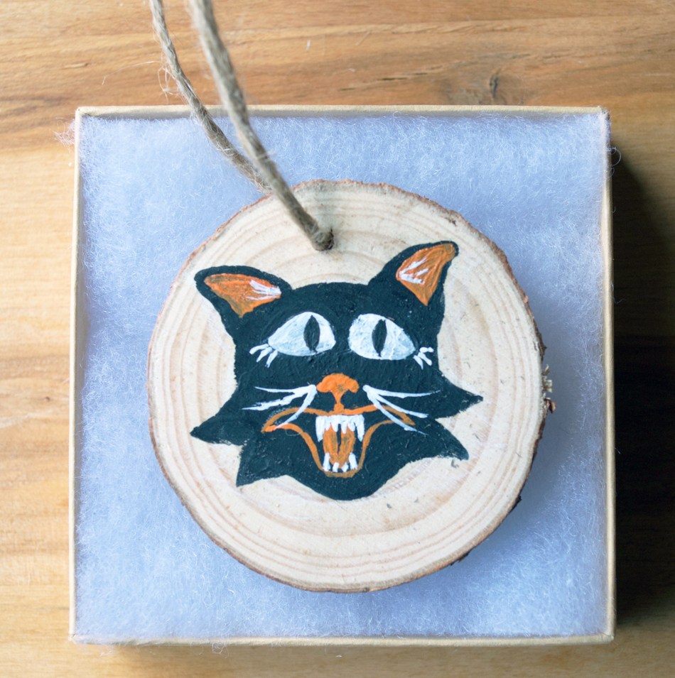 These hand painted wood slice ornaments were made by painting acrylic paint on half inch thick pieces of wood. Halloween is my jam so these were super fun to make. Ornaments are available at my Etsy Store.
