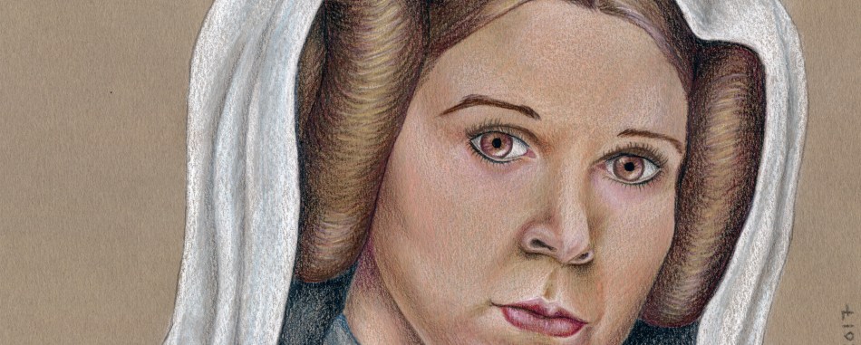 Fan art drawings are available at Etsy Store. This drawing utilized colored pencil on tan paper and brought out both the strength and delicate features of Carrie Fisher’s performance.