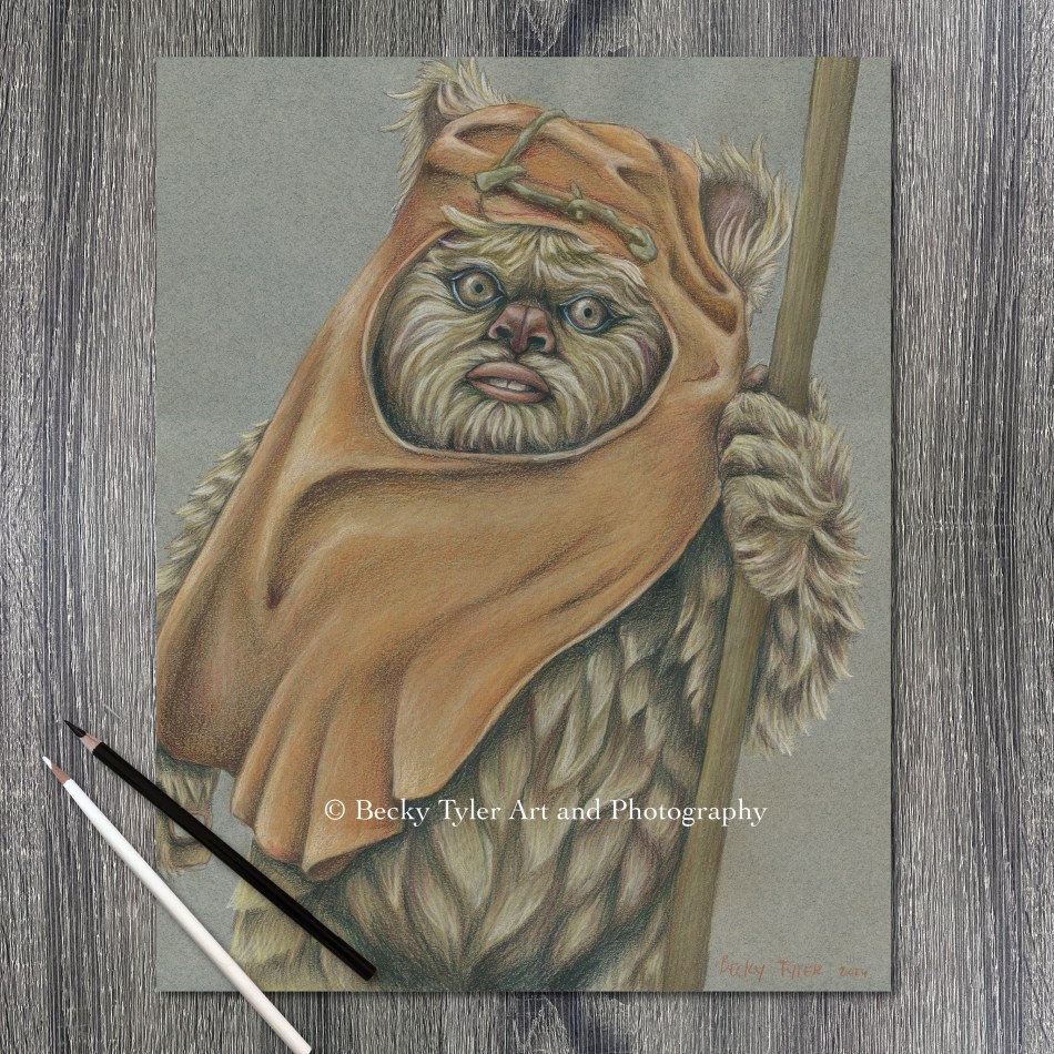 Fan art drawings are available at Etsy Store. This drawing utilized colored pencil on black paper, allowing for the whimsy of the ewok to come through whilst showing the primitive lifestyle the animal lived.