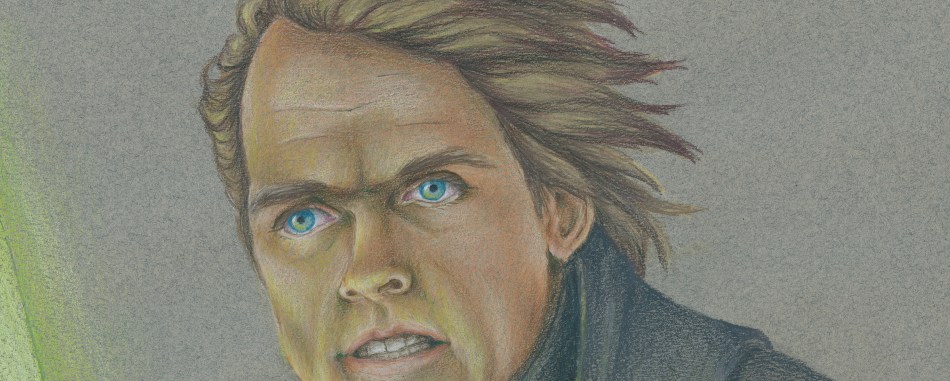 Fan art drawings are available at Etsy Store. This drawing utilized colored pencil on black paper, allowing for the color of the lightsaber to reflect on his clothing and skin.