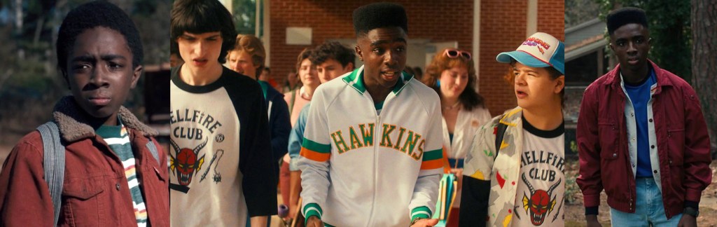 Will also wears a lot of striped shirts. In African cultures stripes symbolize unity, something that the group needs to survive and Will’s struggles in season three trying to keep them together certainly emphasize that. In contemporary times, striped clothing can evoke feelings of playfulness and rebellion which are certainly ongoing themes within Stranger Things. The same holds true for the purple robe Will wears in season three when the boys are playing Dungeons and Dragons. Purple has meanings grounded in creativity and imagination, something that a kid Will’s age would be drawn to as he desperately tries to hold on to his childhood while his friends move on without him.