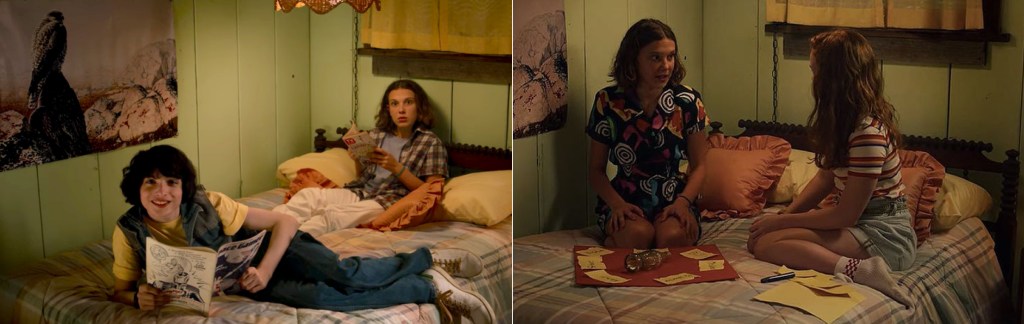 Eleven’s room is decorated in yellow hues making it a happy place for her to exist. Bedding and curtains the color of pale sunshine. The walls are painted a serene pale green. It becomes the place where she and Mike kiss and the place where she and Max become closer friends after their shopping trip at the mall. It is also her refuge when she and Hopper are fighting. The cabin itself often felt like a prison to her in season two, but that bedroom was just for her.