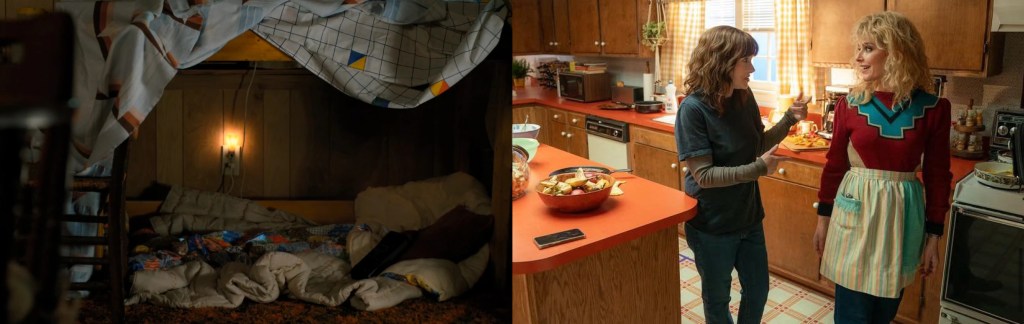 Jim Hopper’s cabin is lit much in the same way the Byers home is, though his homemaking skills are lacking. The mismatched furniture, a red couch and a blue recliner with a smattering of crocheted blankets, are set under the yellow lighting of small lamps. Taxidermy decorates the walls. What was once a hunting cabin is now meant to be a home for Eleven. It shows Hopper’s internal struggles with grief over his daughter’s death, someone he couldn’t save, and his need to be a father to Eleven. To make up for the things in life he failed at. His cabin mirrors his own cracked mental health.