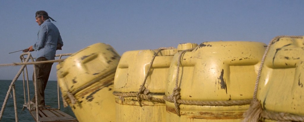 Speaking of great whites, Jaws was notorious for having issues with the animatronic shark they used in the film. It rarely worked and at one point it simply sunk to the bottom one day during filming. What really saved the film was something that did not happen in the book. Brody, Hooper, and Quint managed to shoot a harpoon attached to those yellow barrels in the film. Whenever those yellow barrels surfaced, the both the crew and the viewer knew that the great white shark was near. DANGER, those barrels say. This bloodthirsty great white shark is back. A warning for Hooper, Quint, and Brody. Not that Quint was going to ever listen.